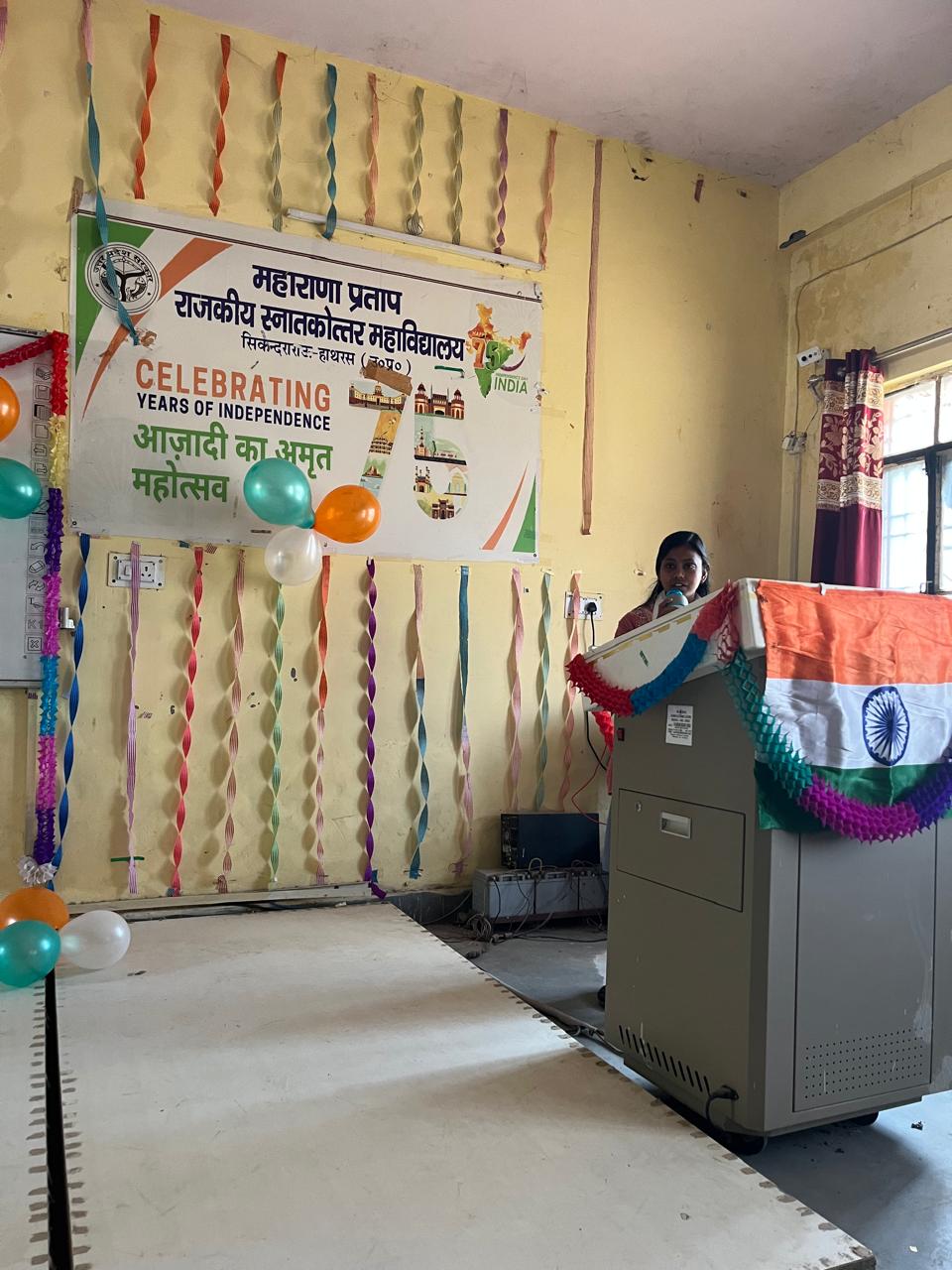 आज दिनांक 26/01/2025 (रविवार) को महाराणा प्रताप राजकीय स्नातकोत्तर महाविद्यालय, सिकंदरा राऊ, हाथरस में 76वाँ गणतंत्र दिवस महाविद्यालय की आदरणीय प्राचार्या प्रो. शैफाली सुमन के कुशल दिशा-निर्देशन में बड़े हर्षोल्लास से मनाया गया। आज गणतंत्र दिवस के पावन अवसर पर महाविद्यालय में आयोजित होने वाले कार्यक्रमों की शुरुआत आदरणीय प्राचार्या प्रो. शैफाली सुमन ने समस्त प्राध्यापकों की गरिमामयी उपस्थिति में 10.00 बजे ध्वजारोहण कर की। इस सुअवसर पर सांस्कृतिक प्रभारी श्री विश्वनाथ प्रताप सिंह ने उच्च शिक्षा निदेशक अमित भारद्वाज जी, उत्तर प्रदेश, के संदेश का वाचन प्राध्यापकों, अन्य कर्मियों एवं छात्र- छात्राओं के समझ किया। इसके उपरांत महाविद्यालय में आदरणीय प्राचार्या प्रो. शैफाली सुमन की अध्यक्षता में विभिन्न सांस्कृतिक कार्यक्रम, जैसे- भाषण, गीत, कविता पाठ, नृत्य का प्रस्तुतिकरण छात्र- छात्राओं ने किया। सांस्कृतिक कार्यक्रमों के आयोजन के क्रम में गगन, मधु, प्रवेश ने देशभक्ति गीतों का गायन किया। अभिषेक एवं विपिन ने राष्ट्रप्रेम जाग्रत करने वाली कविताओं का पाठ औऱ वर्षा, सोनाली, नितिन, नारायण आदि छात्रों ने अमर शहीदों की शहादत को स्मरण करने वाले ओजस्वी भाषण दिए। महाविद्यालय के छात्र- छात्राओं ने महात्मा गाँधी, बाबा साहेब, भगत सिंह, सुखदेव, चंद्रशेखर आज़ाद, सुभाषचंद्र बोस, विरसा मुंडा, उधम सिंह, रानी लक्ष्मीबाई, झलकारीबाई, ज्योतिवा फूले आदि के प्रति स्लोगनों का उद्घोष कर उन्हें अपने श्रद्धा सुमन अर्पित किए और महाविद्यालय के प्रांगण एवं वातावरण को राष्ट्रमयी भावना से ओतप्रोत कर दिया। डॉ. हिमांशु राय ने भारतीय संविधान की निर्माण प्रक्रिया एवं राष्ट्रीय नीति-निर्माताओं के मन-मस्तिष्क में उभरने वाली भारत निर्माण की संकल्पना को छात्र-छात्राओं के समक्ष रखा। आदरणीय प्रो. मंजू उपाध्याय ने कार्यक्रम में सहभागी समस्त छात्र- छात्राओं का राष्ट्रीय नायक-नायिकाओं, स्वतंत्रता सेनानियों के प्रति वैचारिक प्रबोधन कर उनमें राष्ट्रीय भावना, समर्पण, सद्भावना, श्रद्धा जाग्रत किया, जिससे छात्र- छात्राओं के ह्रदय-मन में 'सारे जहाँ से अच्छा, हिन्दुस्तां हमारा' की संकल्पना प्रफुल्लित हो सके। गणतंत्र दिवस समारोह के समापन पर छात्र-छात्राओं को महाविद्यालय की प्राचार्या प्रो. शैफाली सुमन का सारगर्भित एवं जीवन मूल्यों में साकार परिवर्तन करने वाले आशीर्वचन एवं बौध्दिक प्राप्त हुए। प्राचार्या ने 76वें गणतंत्र दिवस के अवसर पर भारत द्वारा विगत 75 वर्षों में समाज के वंचित, शोषित, उपेक्षित वर्ग के सामाजिक, आर्थिक एवं वैचारिक उत्थान की दिशा में अशेष रह गए लक्ष्यों एवं उदेश्यों की प्राप्ति हेतु पूर्ण मनोयो